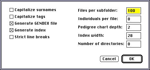 The left side of the dialog includes checkboxes for automatic capitalization of surnames, capitalization of GEDCOM tags, generation of index files, forced generation of a GENDEX index file, and strict interpretation of the GEDCOM standard with regard to linebreaks. Note that when the “Generate index” box is checked, it overrides the “Generate GENDEX file” checkbox, so that a GENDEX file is always produced when an index is produced. This will be clearer in future versions.